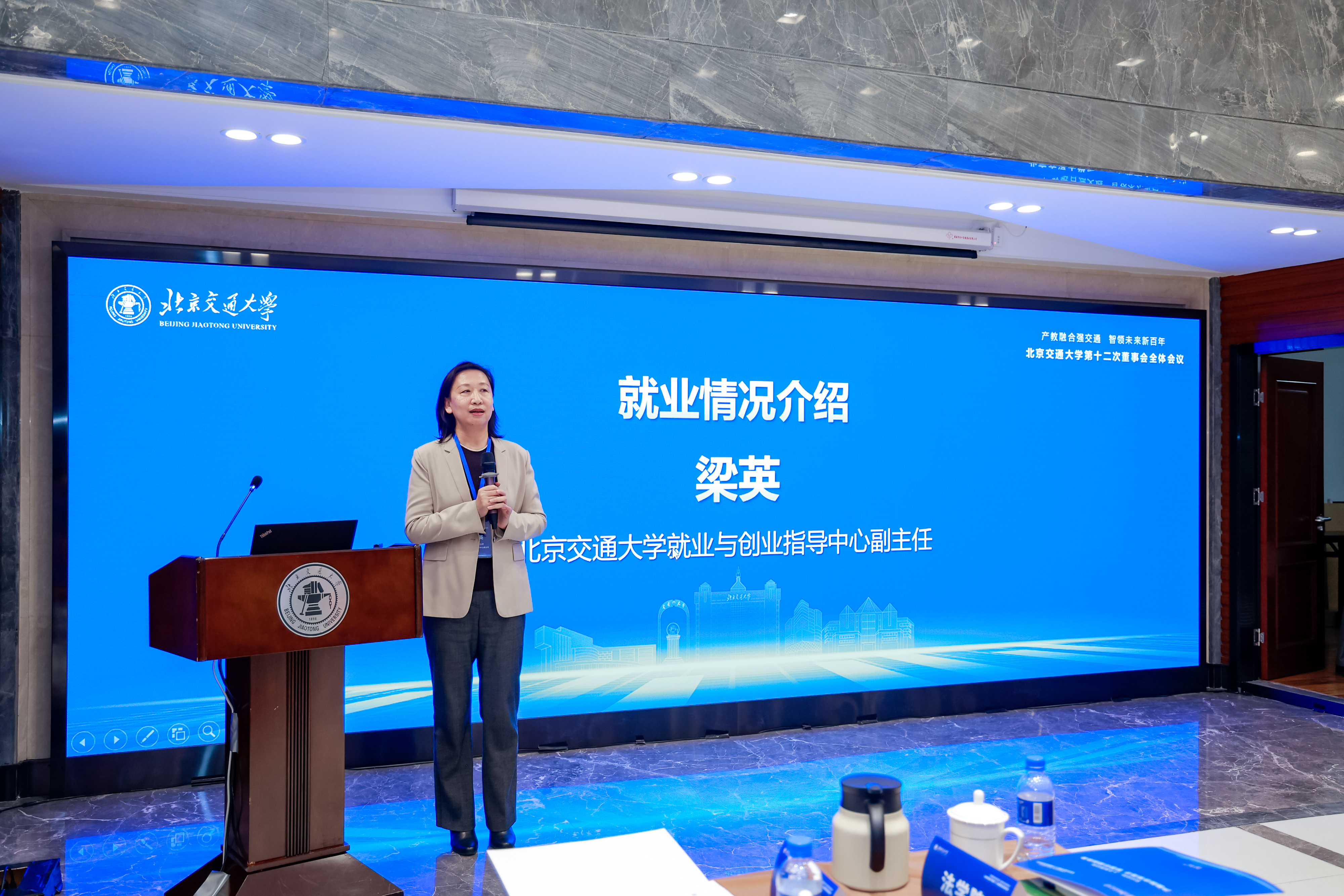 就业与创业指导中心副主任梁英介绍就业相关情况。通过对毕业生深造率、就业去向领域、签约企业等基本情况的介绍,对校企共建就业育人的形势与任务展开讲解,也希望在未来加强与会单位合作、创新校企合作模式。