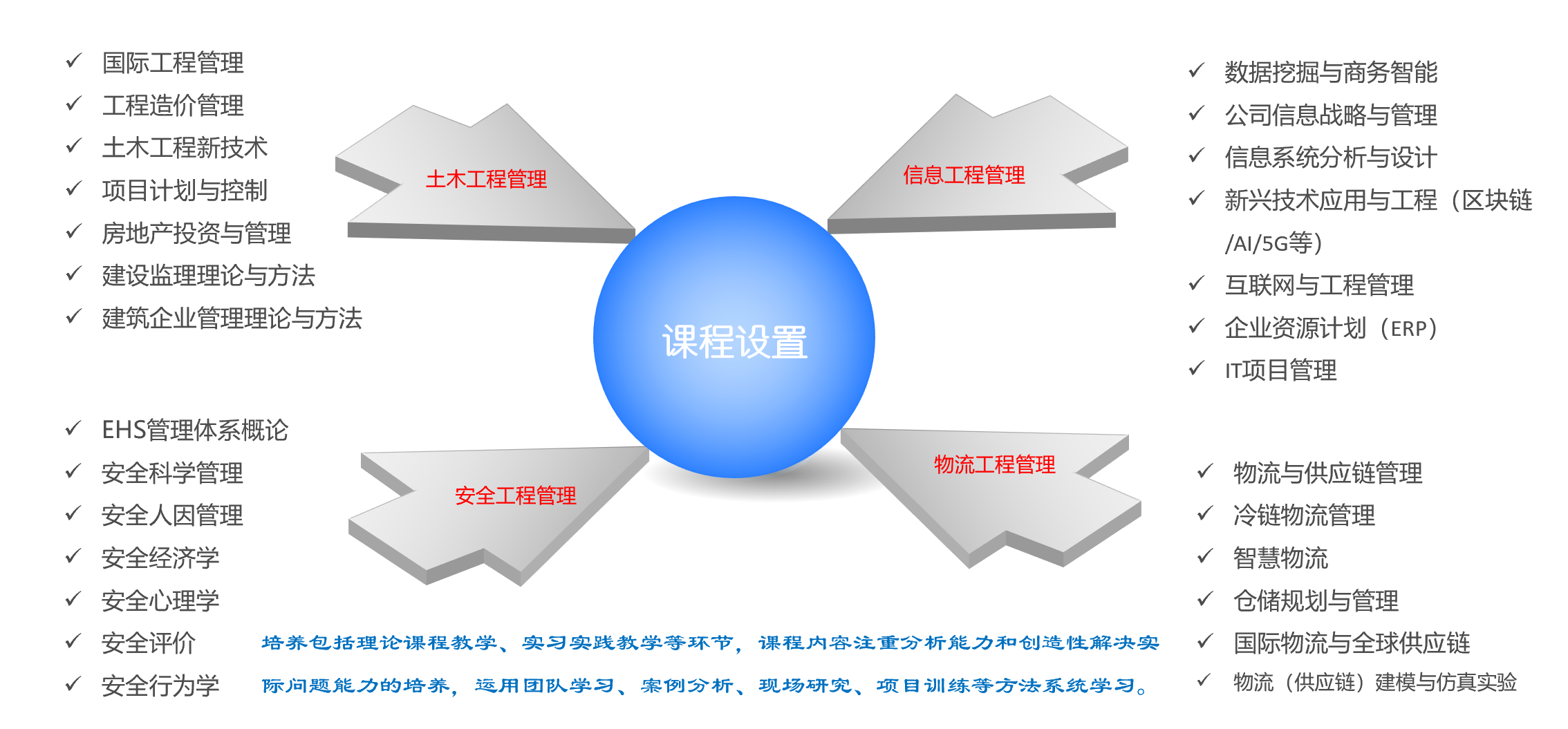 工程管理硕士旨在适应我国现代工程事业的发展对工程管理人才的迫切需求,培养能够独立担负工程管理工作的高层次、应用型工程管理专门人才。工程管理体现工程技术与管理的交叉性,结合我校在理工科类学科优势和特色,工程管理硕士专业学位设置四个研究方向,分别为:土木工程管理、信息工程管理、安全工程管理、物流工程管理。