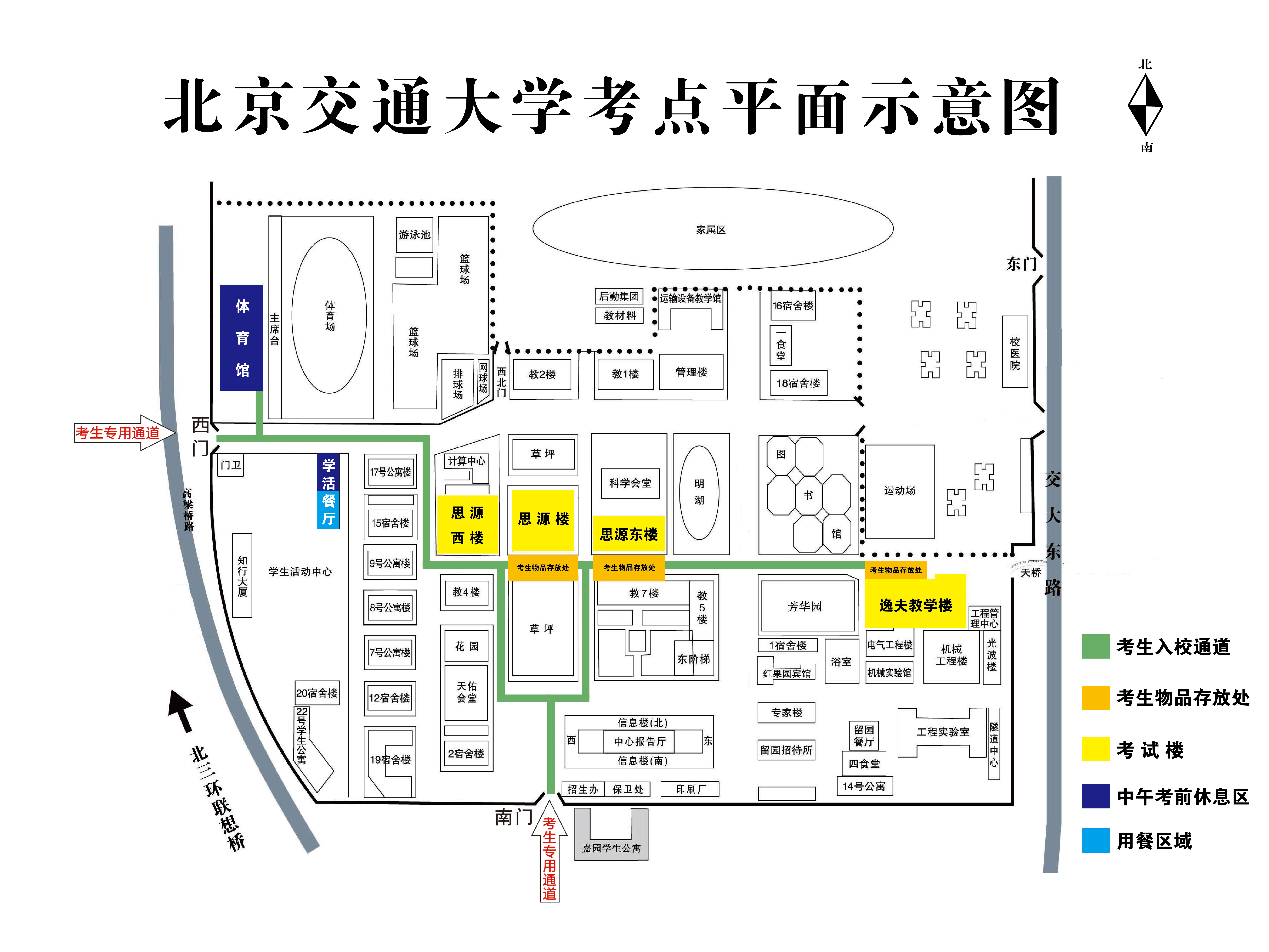 学校安排学生活动中心一层为校外考生中午就餐区和休息区,安排西门体育馆为校外考生考前休息区(开放时间:11:30-13:30)。