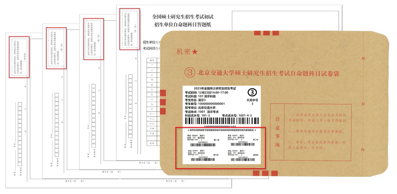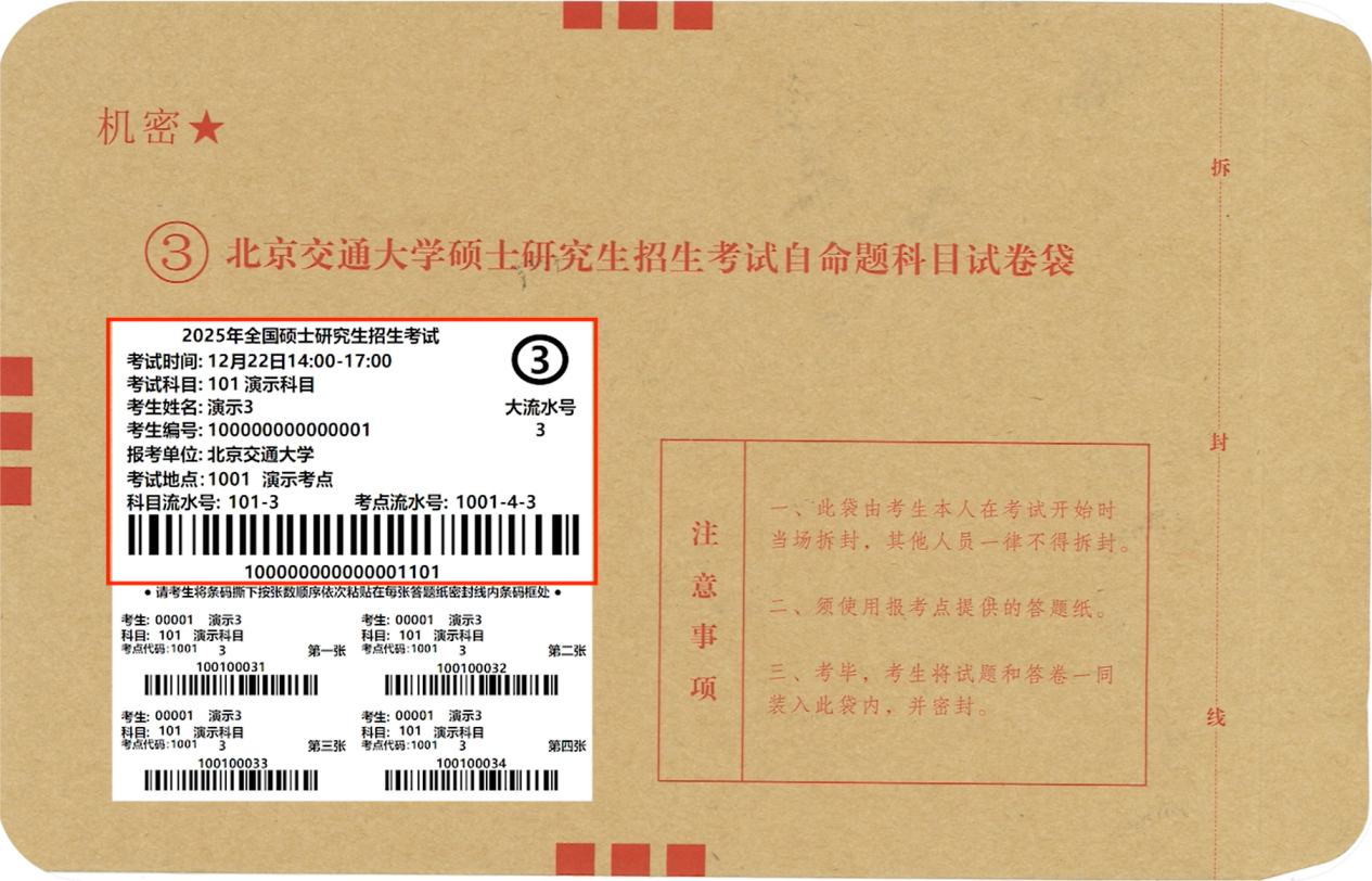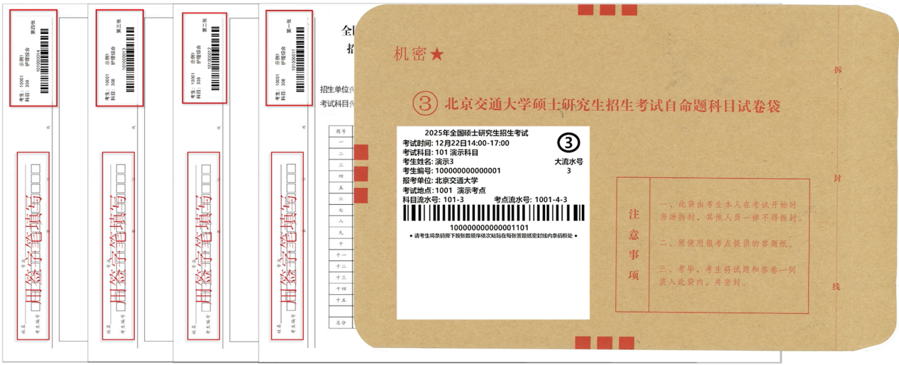 参加考试时,考场会发放自命题科目答题纸,其左上角设有条码粘贴区域,并且带有序号,同时,每位同学将会获得带有答题纸条形码的试题信封。
