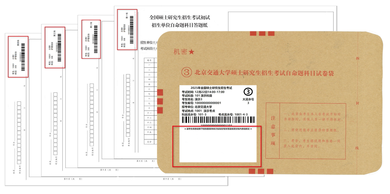 北京交通大学硕士研究生招生考试自命题将于今年起采用电子阅卷,参加考试时,每位同学(考901设计创意、910建筑快题设计、911城乡规划快题设计的科目除外)将会获得带有答题纸条形码的试题信封,考场会发放自命题科目答题纸,其左上角设有条码粘贴区域。请报考北京交通大学(10004)且使用自命题科目的考生认真阅读本说明。报考其它招生单位的考生请关注所报考招生单位的相关通知。