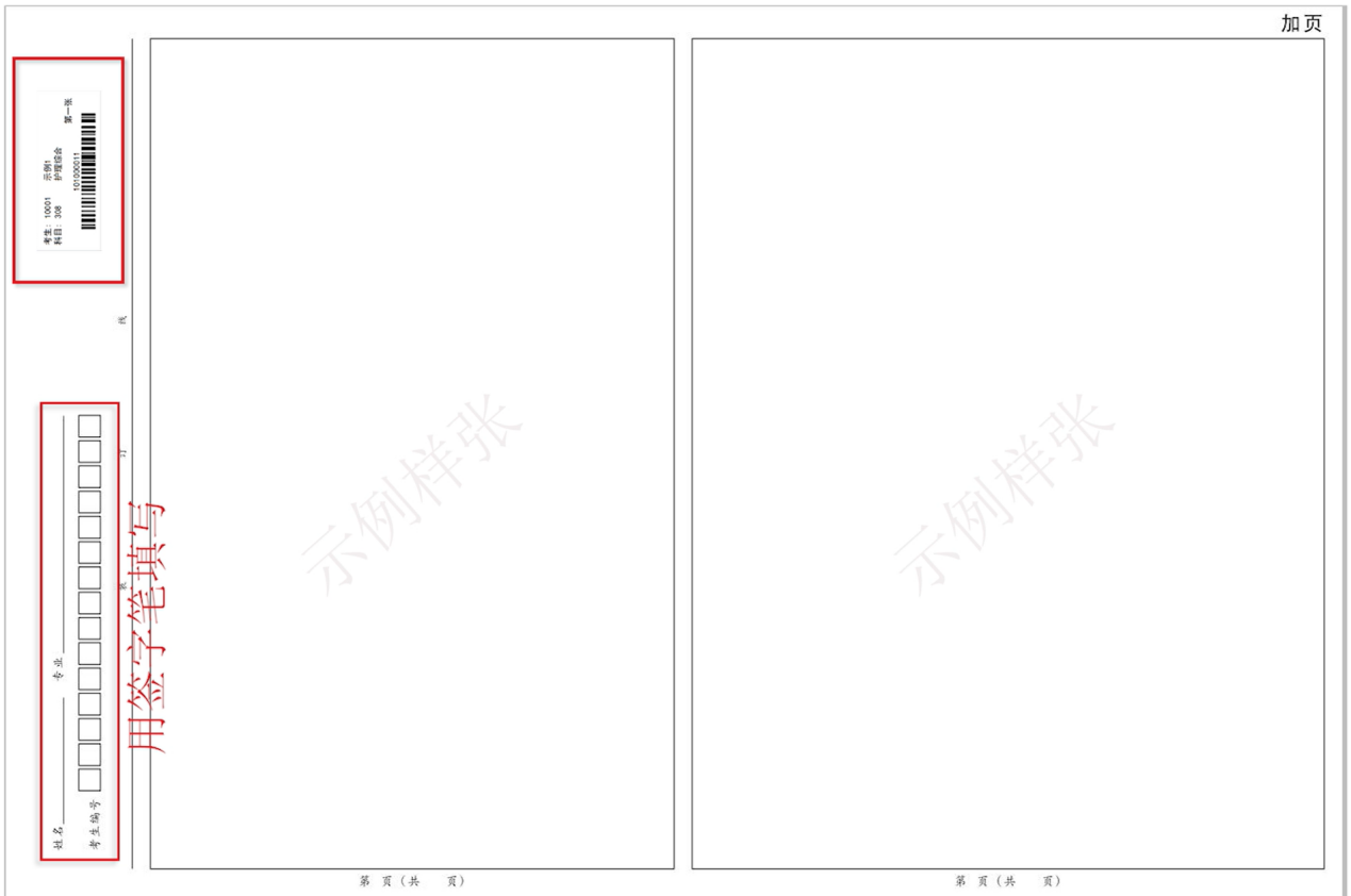 3. 如果使用了加页答题纸(超过4张),那么加页答题纸不用粘贴条形码,只需填写姓名、专业、考生编号,然后正常答题即可。